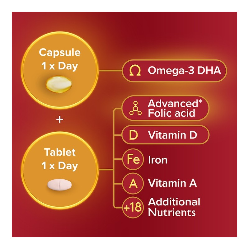 *Compared to Folic Acid, L-methylfolate is a form of folate which is ready to be used directly by your body. ¹Maternal intake of Omega-3 DHA contributes to the normal development of brain and eyes in breast-fed infants. A beneficial effect is obtained with a daily intake of 200mg DHA in addition to the recommended daily intake of Omega-3, 250 mg of EPA and DHA combined. ²Vitamin B6 and Iron contribute to normal energy release. ³Vitamin D, Calcium and Zinc contribute to the maintenance of normal bones. 4Iron has a role in the normal formation of red blood cells and haemoglobin. 5Vitamin B12, Iron and Folic Acid help reduce tiredness and fatigue. 6Vitamin D and Iron contribute to the normal function of the immune system, and play a role in the process of cell division.