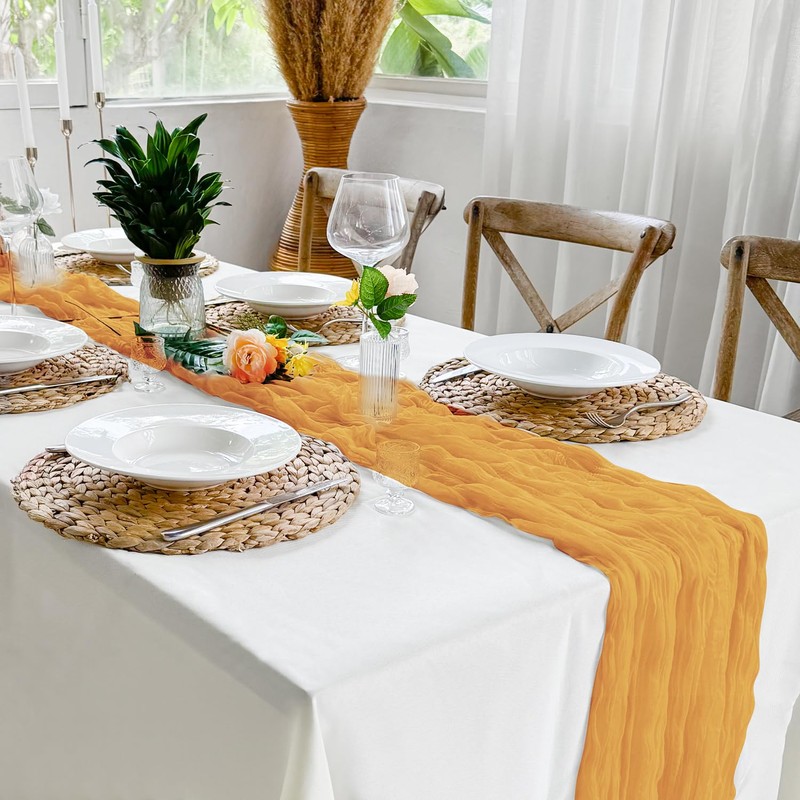 - Versatile: The boho style cheesecloth table runner is versatile due to its design and can match any decor choice, It easily goes from classy and simple to divine and elegant. It can be used for weddings, bridal shower, outdoor parties, baby shower, birthday,anniversarie, graduation, dinner, festivals, Valentine's Day, Easter,Thanksgiving, Ramadan, Halloween, Christmas and daily use. Can also be used as curtain decorations, placemats, home decoration