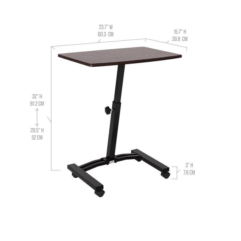 Work the way you want with Seville Classics' Mobile Laptop Computer Desk Cart. Designed with mobility in mind, the cart features four smooth-gliding, 1.5 inch casters so you can take your work with you; two lock so the desk stays where you leave it. Easily move your laptop or writing workstation to any space in your home, dorm, or office. Manually adjust the desk's height and keep it there with the locking knob. Desk features a steel frame for stability, durability, and strength. Install the four 1.5 inch casters to enjoy the freedom of a mobile desk that goes where you do. Base stands 2.25" with wheels. * Four 1.5-inch casters (2 locking) allow your work to travel with you anywhere in the office or at home * Height-adjustable surface allows the desk to be used while sitting * Low-profile, rectangular metal base allows easy use near other furniture * Welded metal construction ensures the cart is sturdy, but lightweight * Easy assembly with no drilling required * Dimensions: 23.625" W x 16" D x (20.5" to 33" H) * Adjustment Type: Manual * Weight Capacity: 15 lbs. * Weight: 11 lbs. * Model #: WEB162