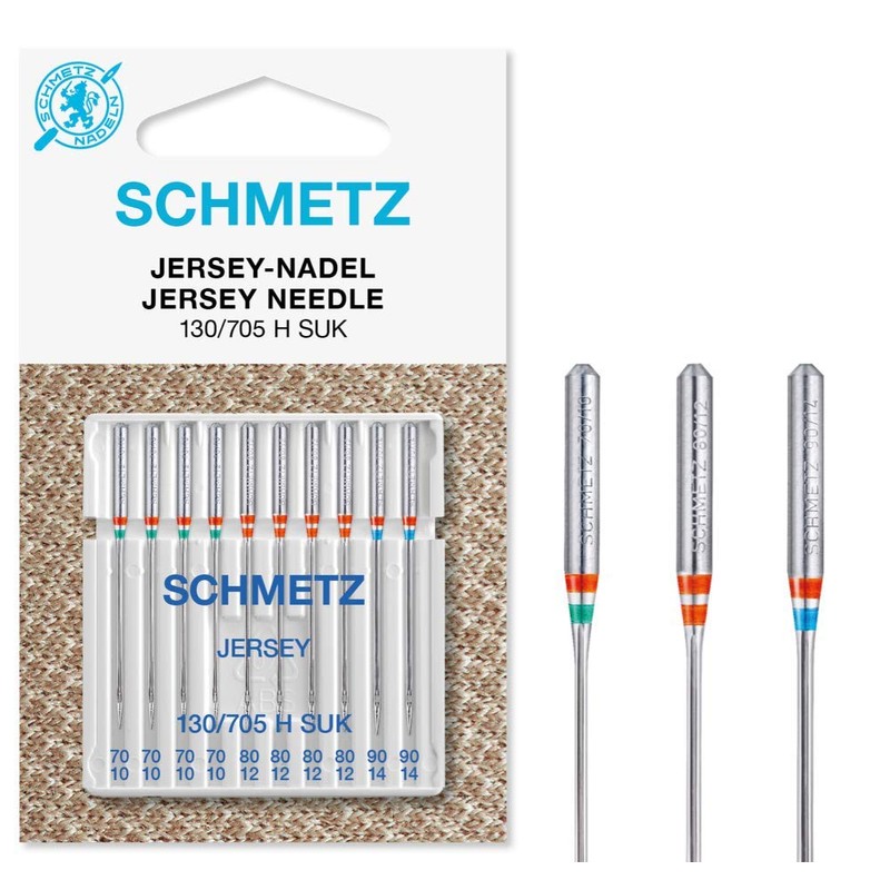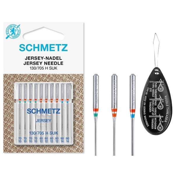 Sewing Machine Needles Schmetz - Jersey (Ball Point), Pack of 10, Assorted Sizes 70/10, 80/12 & 90/14 (Single Packet) Includes Large Schmetz Needle Threader
