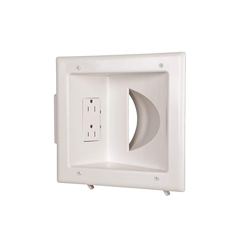 * Conceals multiple AV cables behind your flat TV.* 15 Amp/125V tamper resistant, duplex receptacle.* Work box included.* Mounting wires are molded into the media plate and fasten tightly against the back of the drywall.* Quick and easy installation.