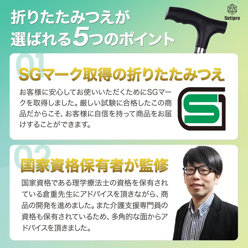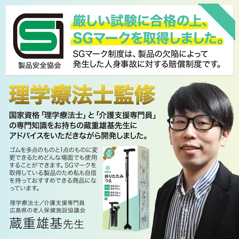 - 【理学療法士監修】国家資格である理学療法士の蔵重雄基先生監修の元、商品化した折りたたみ杖。理学療法士、介護支援専門員の専門知識を持つ蔵重雄基先生からのアドバイスを受けながら、安全で使いやすいつえを目指しました。