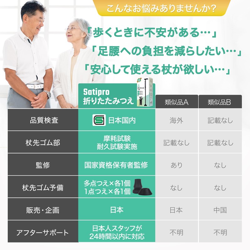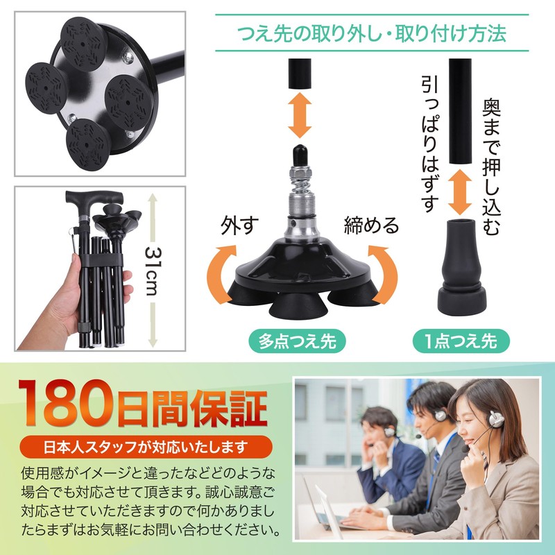 - 【商品仕様】○多点つえ長さ:87cm~97cm ○1点つえ長さ:84cm~94cm ○調整:それぞれ5段階で調整可能 ○折りたたみ時サイズ:長さ31cm、幅13cm ○重量:多点つえ435g、1点つえ318g ○素材:グリップ:PP(ポリプロピレン)、シャフト:アルミ、杖先ゴム:TPR(熱可塑性ゴム) ○お届け内容:つえ本体、ゴム先(多点用×4、1点用×1)、予備ゴム先(多点用×4、1点用×1)、日本語説明書 ○発売元:Satipro <180日間保証>使用感が違ったなどどのような場合でも誠心誠意ご対応させていただきます。何かありましたら、まずはお気軽にお問い合わせください。