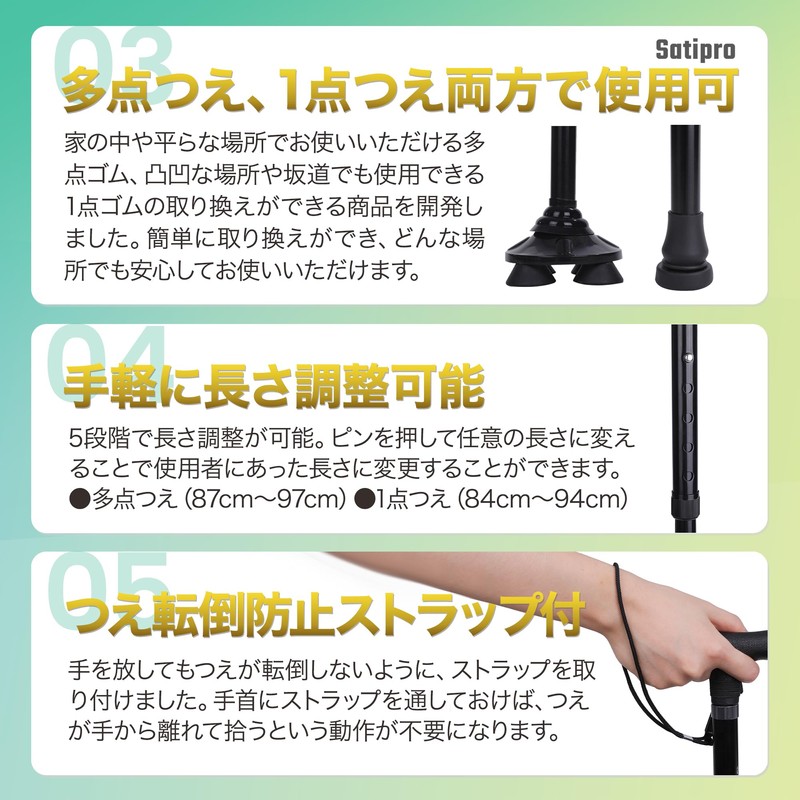 - 【長さ調整可能】多点つえ、1点つえともに5段階で長さの調整が可能です(多点つえ:87cm~97cm/1点つえ長さ:84cm~94cm)ご使用者にあった長さに調整して、お使いいただけます。
