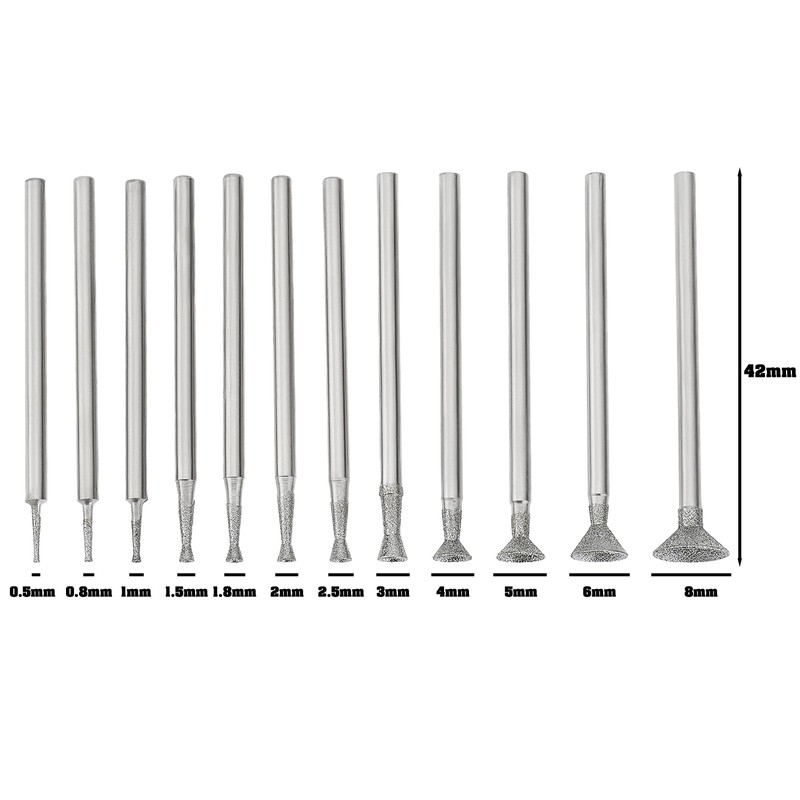 - The package includes: 12 drill bits of different shapes and specifications, including 0.5 mm, 0.8 mm, 1 mm, 1.5 mm, 1.8 mm, 2 mm, 2.5 mm, 3 mm, 4 mm, 5 mm, 6 mm, 8 mm, 1 x each.