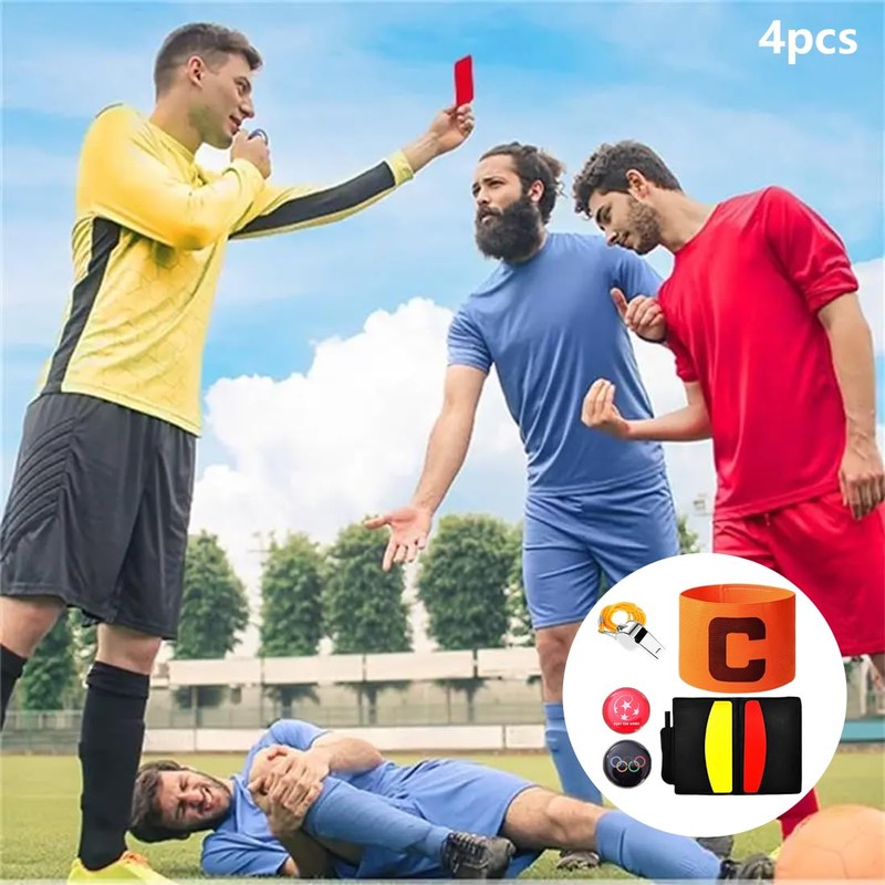 - Professional Referee Set: This comprehensive referee set includes a double-sided side thrower, red and yellow cards, 2 striped captain's bandages and a robust metal whistle with lanyard. Perfect for football referees and other sports, it provides everything needed for clear and professional game leadership
