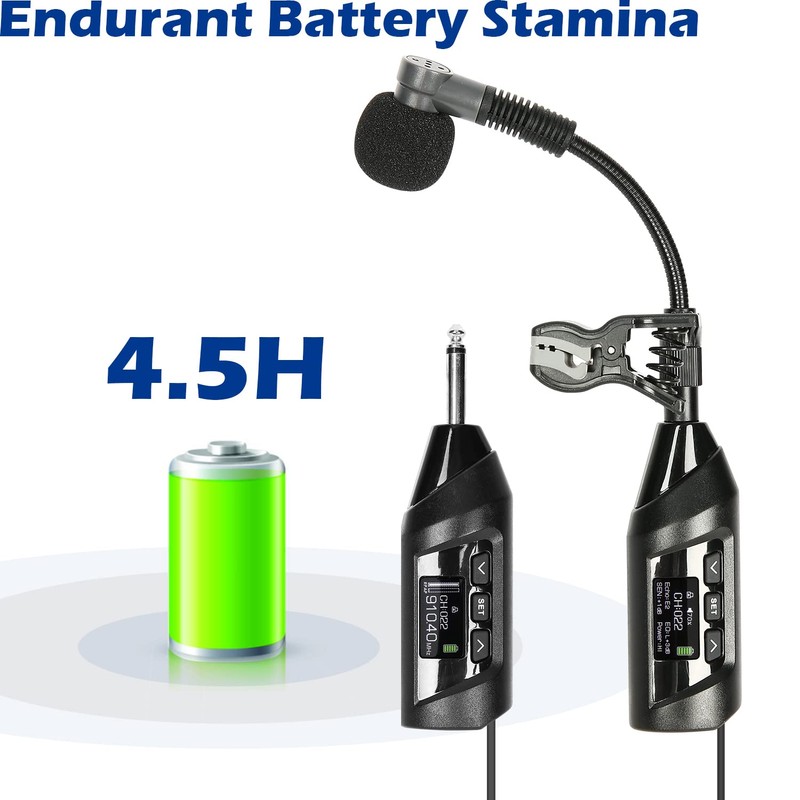 - HIGH EFFICIENT BATTERIES: The rechargeable transmitter and receiver are up to 4.5 hours stamina when fully charged. With the included charger, you are able to charge both at the same time. A sax mic and trumpet microphone that offers secure stamina for your performance.