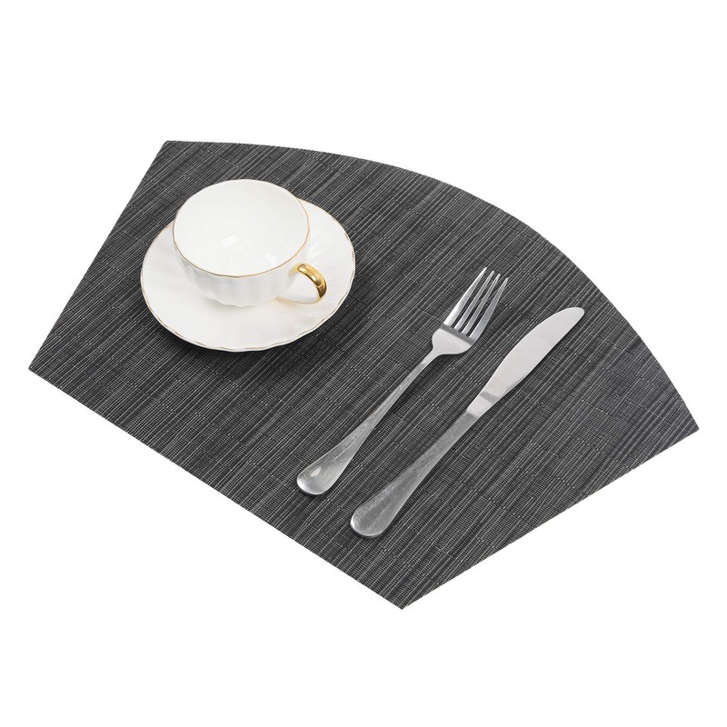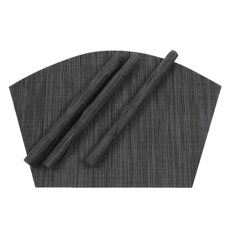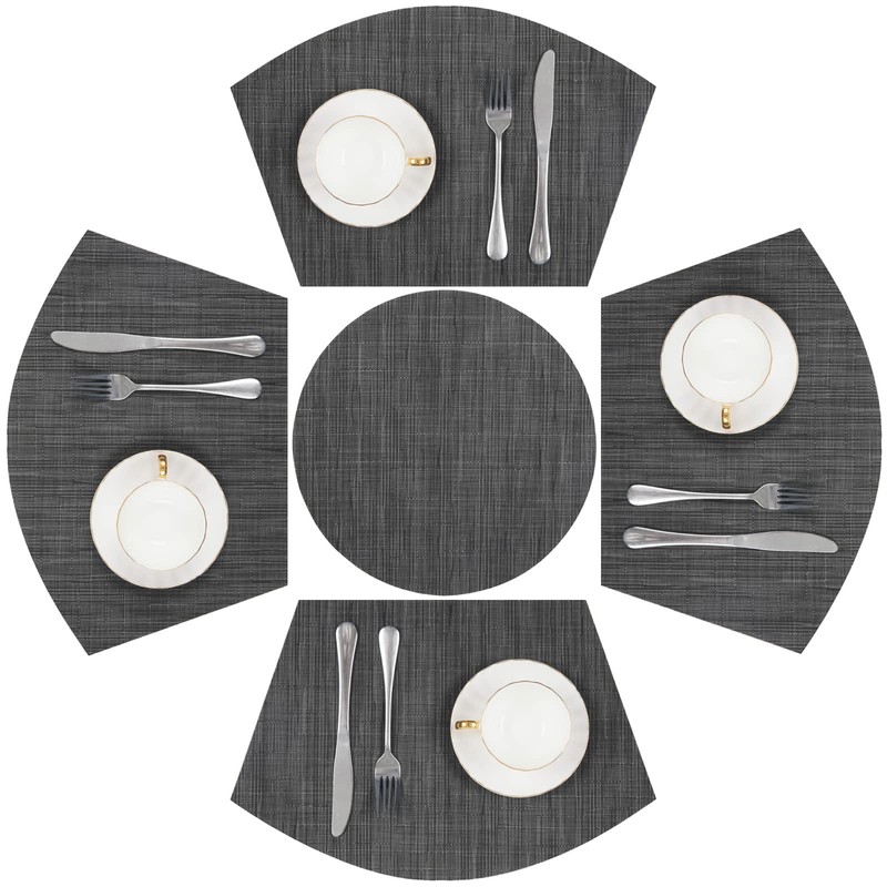 - Hecho de 70% PVC, 30% poliéster, juego de 5, incluyendo 4 manteles individuales de cuña y 1 mantel individual redondo. Patrón de tela de cesta. Duradero y reversible.