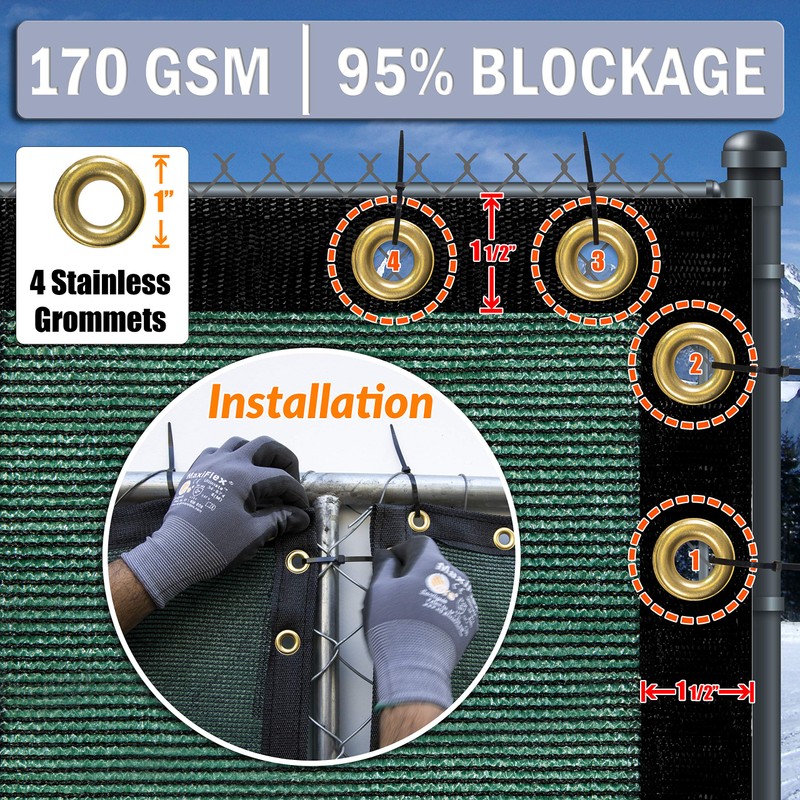 - ★【Grommets】: Installation made simple with stainless brass copper grommets evenly placed 2 ft. apart horizontally and 1 ft. apart vertically; each fence screen sports an industry-leading 4 grommets at each corner.