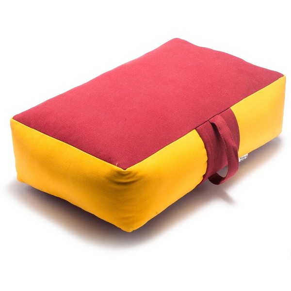 A rectangular meditation cushion providing lift for proper alignment during meditation. The straight edges do not interfere with heel positioning. The lift provided is preferred by those with greater flexibility or who are of average height or lower. Natural kapok fiber filling. Made in Nepal.