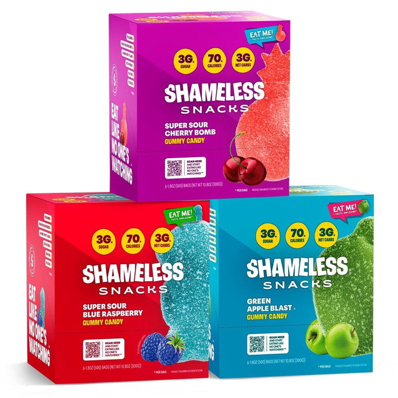 Shameless Snacks Sour Flavors Bundle Healthy Low Carb Keto Gummies Cherry Bomb, Blue Raspberry and Green Apple