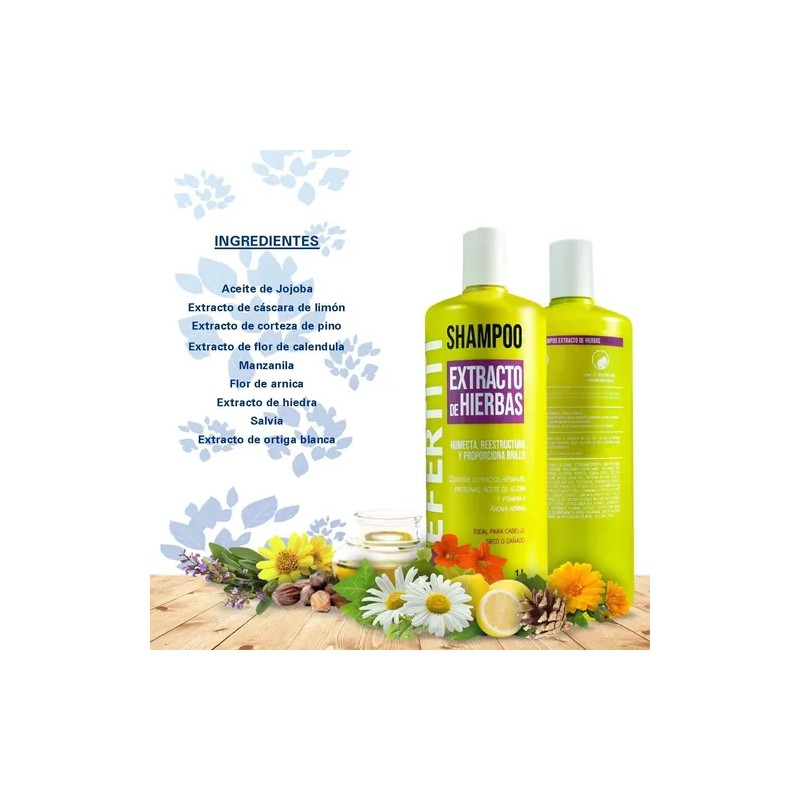 Contiene proteínas, vitamina E, extracto de hierbas y aceite de jojoba que humectan y reestructuran la fibra capilar para mantenerse el cabello sano y con brillo.