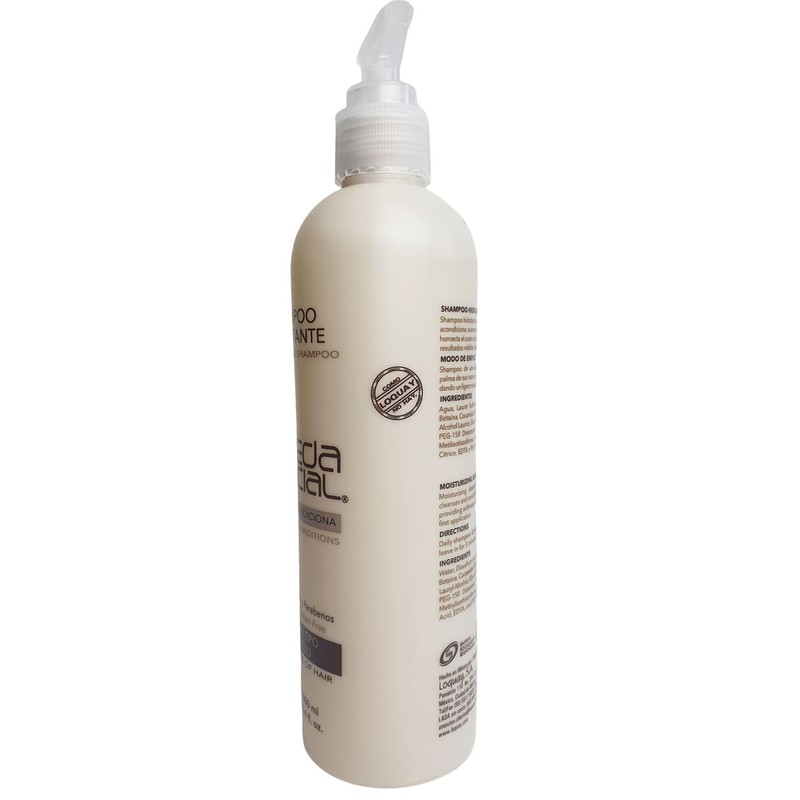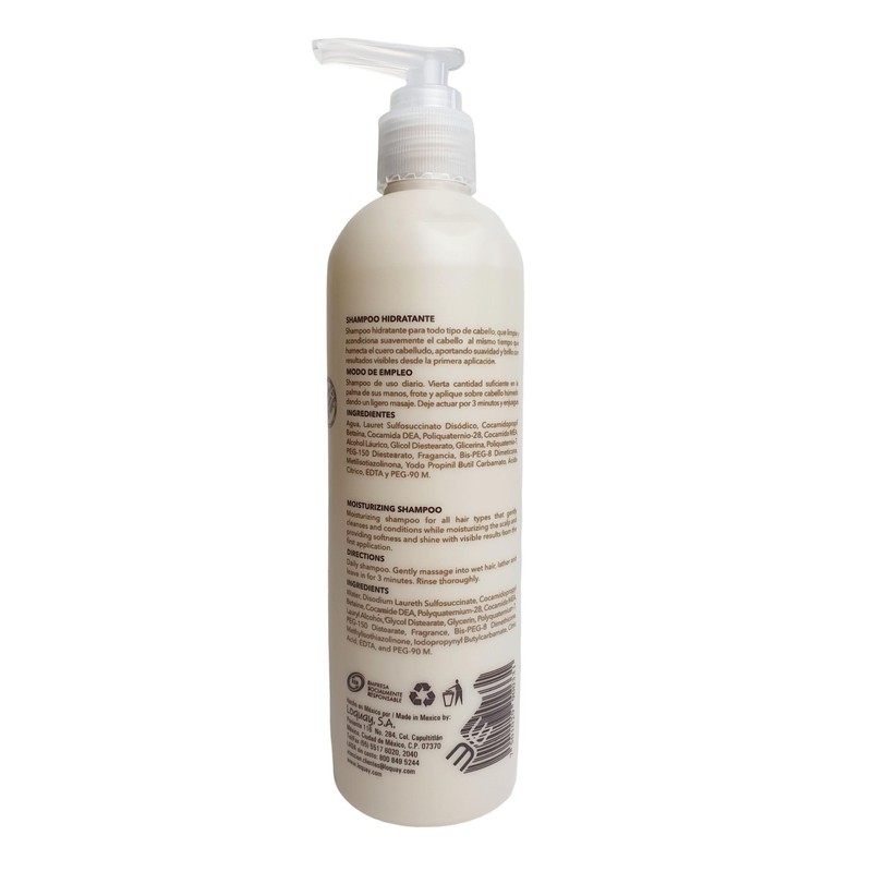 - LIBRE DE SULFATOS Y PARABENOS Shampoo Hidratante para todo tipo de Cabello, limpia y acondiciona suavemente el cabello al mismo tiempo que humecta el cuero cabelludo, aportando suavidad y brillo con resultados visibles desde la primera aplicación. Contenido: 300ml