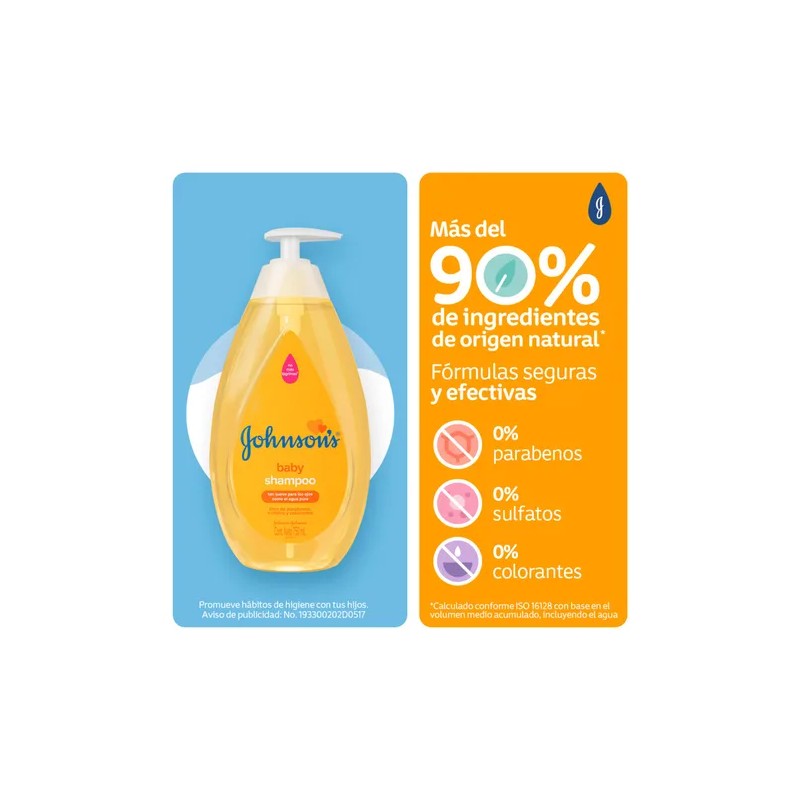Shampoo Johnson's Original limpia suave y efectivamente el pelo del bebé, mientras protege su cuero cabelludo del resecamiento. Posee una fórmula tan suave para los ojos como el agua pura. Desarrollado con ingredientes de origen natural* como la glicerina vegetal, que ayudan a hidratar el pelo del bebé.