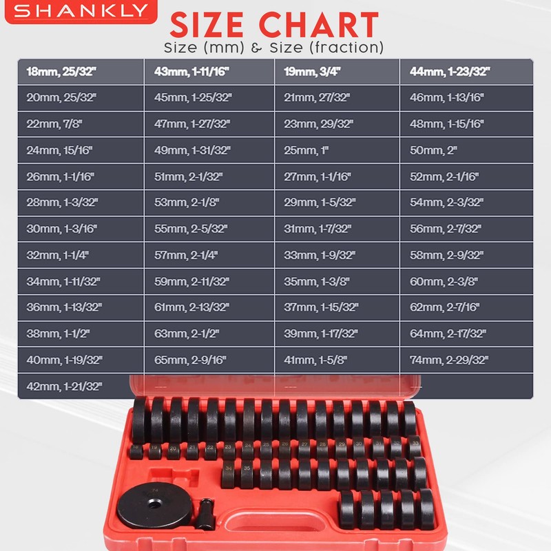 The Shankly bushing removal tool kit allows you to build your own custom bushing driver so you always have the right size for the job. The Shankly bushing removal tool kit allows you to build your own custom bushing driver so you always have the right size for the job. The discs go from 18mm (.7 inches) all the way to 65mm (2.51 inches) in 1mm increments plus 74mm (2.91 inches). All discs are connected with a 12mm (.47 inches) shaft and screw which quickly connects to a 180mm (7.08 inch) handle. Making the Shankly wheel bearing driver set complete and effective. All 50 pieces are interchangeable with each other so you get different sized variations in one set, allowing the mechanic to complete the job quickly, professionally and promptly. The Shankly bearing and seal driver set has 50 interchangeable discs, giving the user an amazing 2,450 different variations due to each of the 50 discs being interchangeable with each other. Set comes in a heavy duty, blow molded case with compartments for every piece, making storage and transport easy and manageable.
