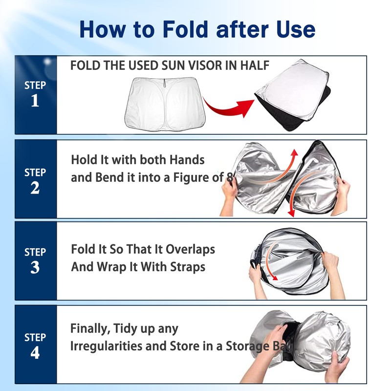 - Die langlebige und effiziente: Windschutzscheiben-Sonnenblende hat ein leichtes, faltbares Design, das einfach zu handhaben und zu benutzen ist. Die Sonnenblende l?sst sich im Handumdrehen ein- und ausklappen, so dass sie schnell und einfach auf- und abgebaut werden kann