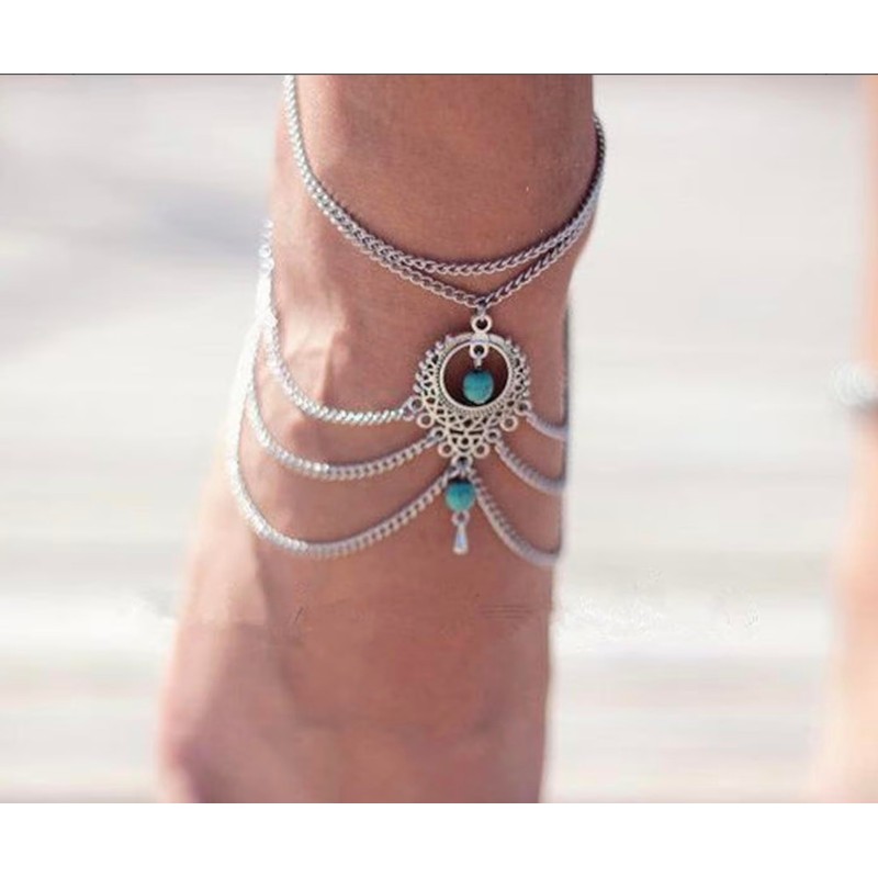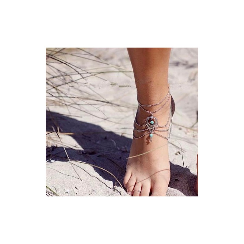 Enhance your bohemian beach look with the captivating silver multi-layer foot and ankle chain adorned with beautiful blue beads. This accessory effortlessly creates an effortless and stylish vibe, perfect for beach and summer wear. Wear it with bare feet to showcase its beauty or pair it with sandals for a versatile and fashionable look that's bound to turn heads.
