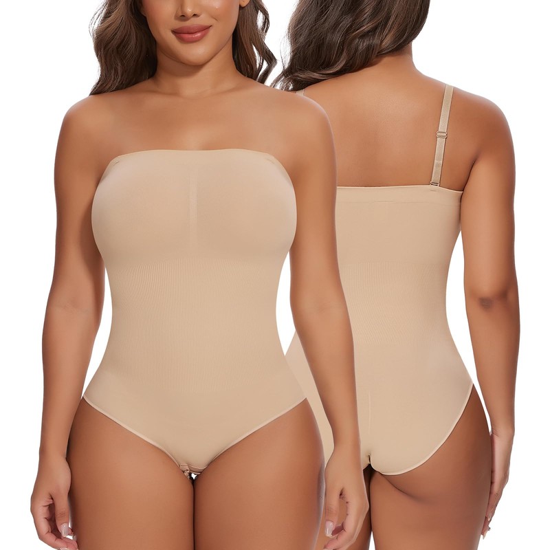 SHAPERIN Women Strapless Shapewear Bodysuit Tummy Control Push Up Shaping Bodysuit Seamless Body Shaper Compression Leotard Bandeau Bodysuit Top, Beige, M
