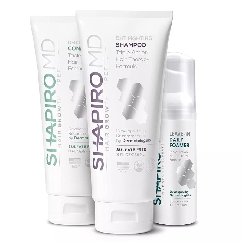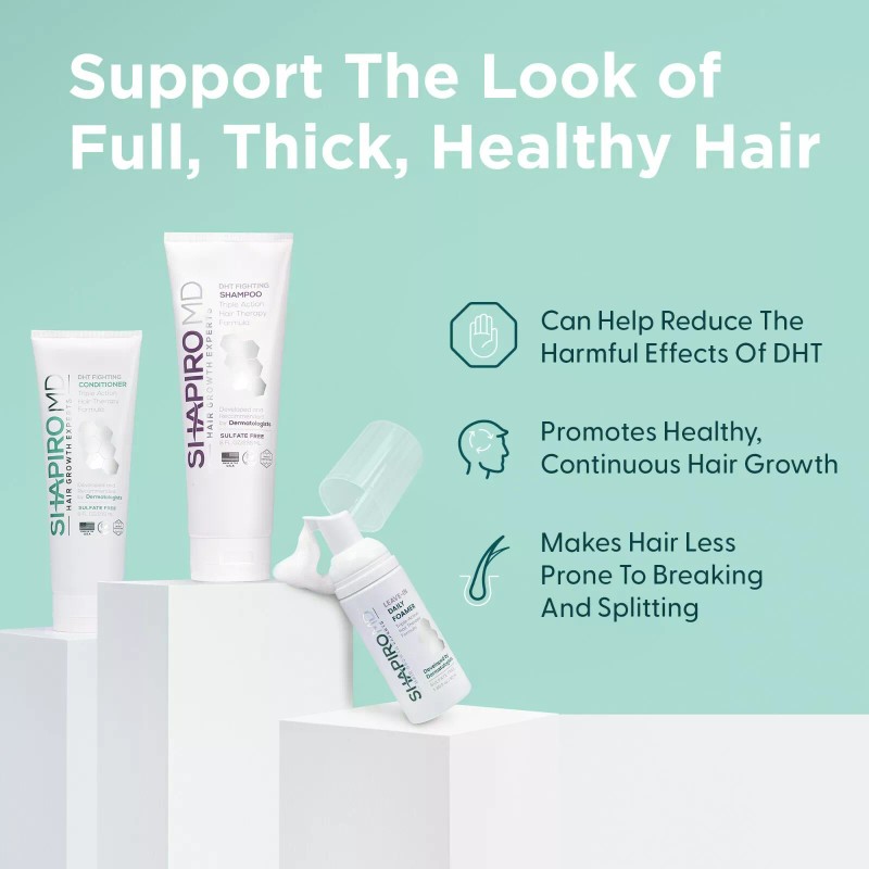 SHAPIRO MD Hair Growth Experts - Hair Regrowth Kit A UNIQUE HAIR LOSS SYSTEM DEVELOPED TO HELP MEN & WOMEN REGAIN THICKER, FULLER LOOKING HAIR. GET STARTED WITH OUR TRIPLE-ACTION HAIR CARE AID TODAY! Fights DHT Designed for Both Men & Women Powerful & All-Natural Ingrediants Achieve Thicker, Fuller, Healthier Hair Developed by Distinguished Dermatologists Dr. Steven Shapiro, M.D., and Dr. Michael Borenstein, M.D. PhD Kit Includes: One Month Supply Shampoo One Month Supply Conditioner 1.5 oz Bottle of Leave-In Daily Foam