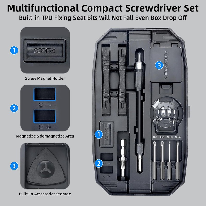 • 【Secure & Organized】 This tiny screwdriver set comes with a double-sided sturdy case. Each bit is securely molded into the storage slot with size markings for easy identification. The case also features a built-in magnetizer to magnetize your screw drivers, as well as a magnetic screw holder to keep small screws and other accessories. The ABS latches provide secure storage and transportation