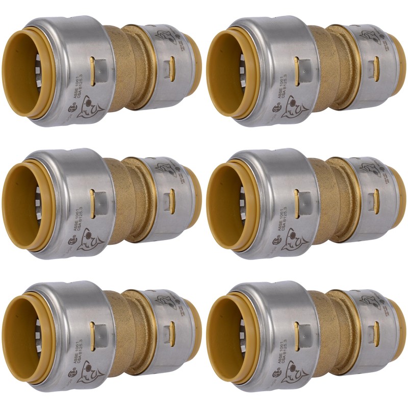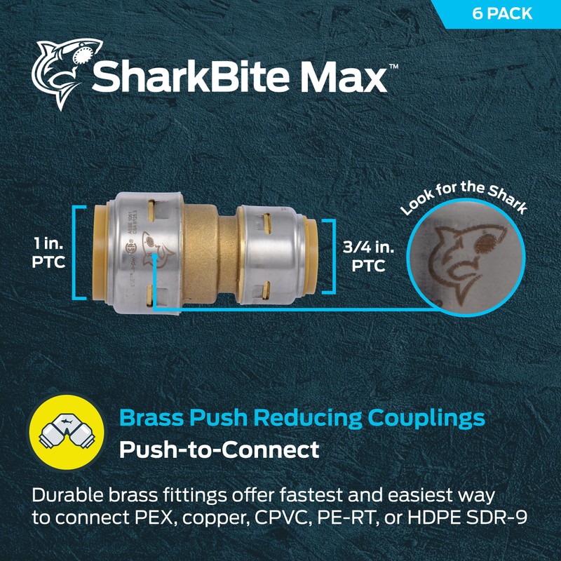 SharkBite Max 1 x 3/4 Inch Reducing Coupling, Pack of 6, Push to Connect Brass Plumbing Fitting, PEX Pipe, Copper, CPVC, PE-RT, HDPE, UR060
