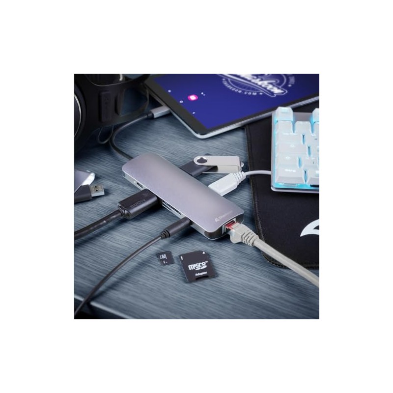 - Clever port extension: The USB 3.0 Type C Combo Adapter expands devices with USB Type-C female with three USB Type A ports, a card reader for Micro SD and SD/MMC cards, an HDMI port with 4K output at 30 Hz, a TRRS socket for TRRS-enabled headphones, an RJ45 network port and a USB 3.0 charging port From Type C. About these connected devices are supplied with power, whereby the Combo Adapter is designed for a maximum output power of 60 watts.