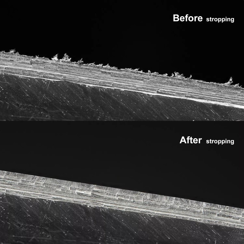 Step 1.Apply the polishing wax evenly on the cowhide leather until it covers the entire surface. | Step 2.As shown in the picture, it should be drawn upward against the direction of the blade until you get an extremely sharp edge. | Step 3.Turn the blade over and do the same on the other side like step 2. Note: The blade should be against the direction of the moving to avoid cutting the strop. | FinishedYou will get an extremely sharp knife or tool like new. Note: Strop is recommended to use before you think the edge is dull. It's the key to keep a razor sharp edge by using it consistently. |