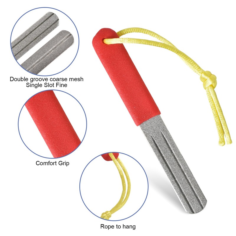 - Double-sided design: hook sharpeners are double-sided with fine grain single groove on one side and medium grain double groove on the other, three grooves in total, ideal for sharpening fishing hooks
