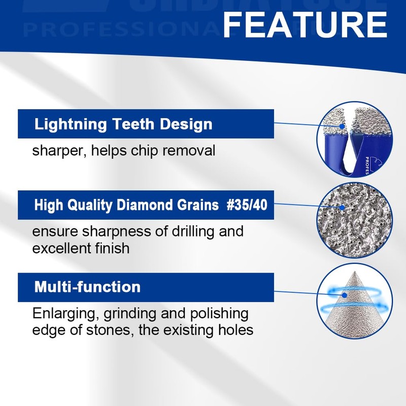 - 【Lightning Teeth Design】 diamond hole saw has Lightning-shaped teeth on the top to ensure sharp teeth and fast drilling speed. The chip removal grooves can quickly discharge dust during the drilling process and is not easy to block, thus improving the work efficiency