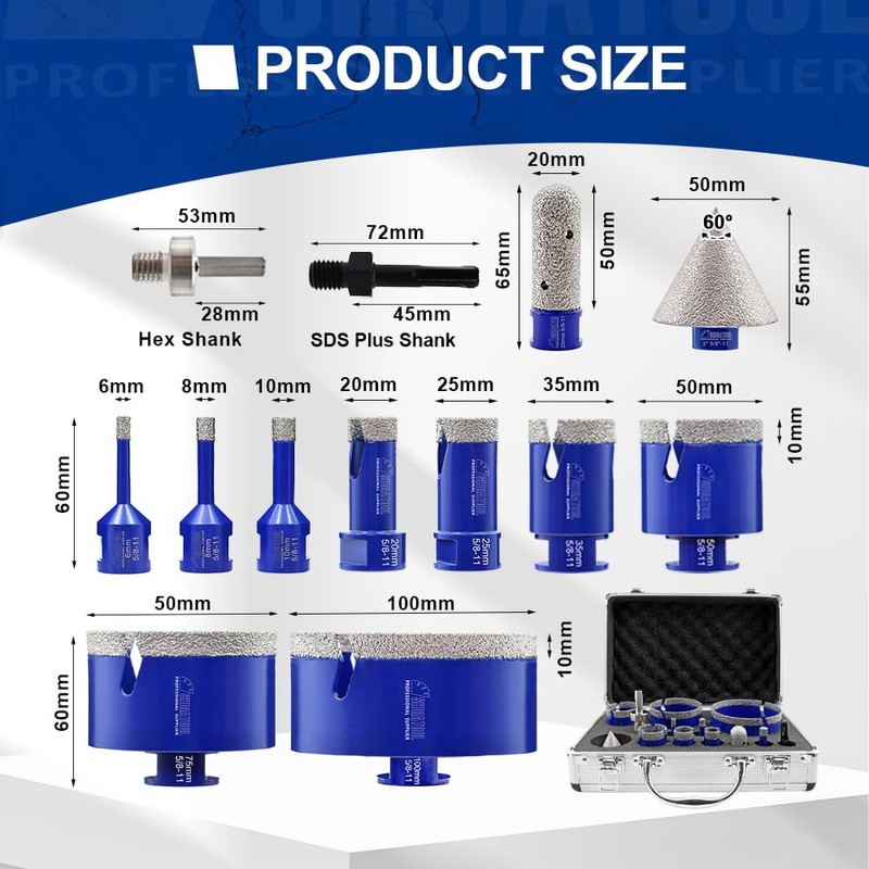 SHDIATOOL Diamond Tile Drill Bits Kit 13pcs, Porcelain Hole Saw Sets, Core Bits Cutter for Drilling Ceramic Marble Granite (6/8/10/20/25/35/50/75/100/20MM/2/SDS/HEX)