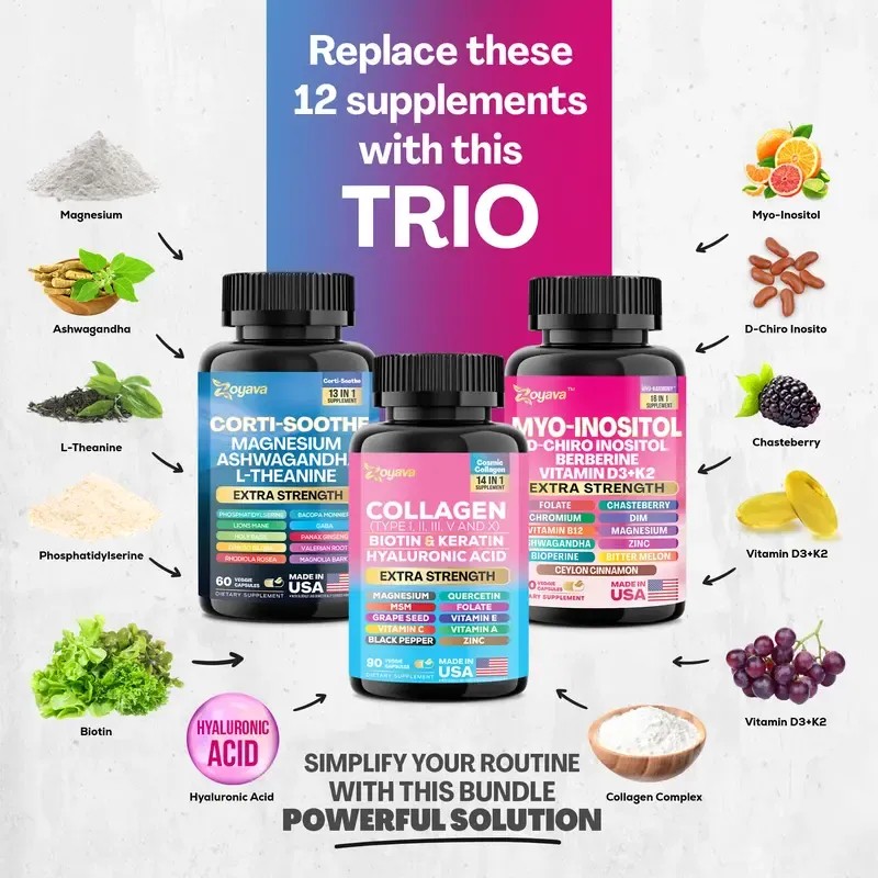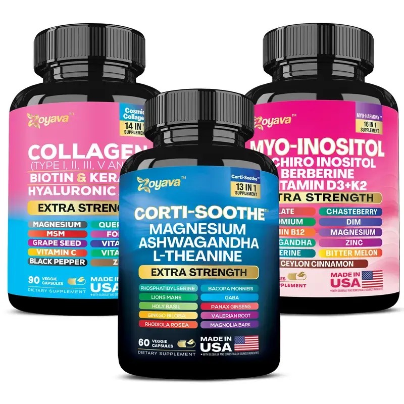 She Shines Set - Zoyava Ultimate Women's All-in-One Supplement with Corti-Soothe, Myo-Inositol, Collagen & Extra Strength Ingredients - Made in USA