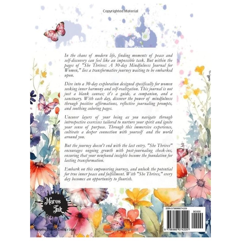Discover Your Radiant SelfWelcome to She Thrives, a remarkable 30-day journey of self-discovery, mindfulness, and inner peace.This thoughtfully designed journal is your guide to a transformative experience tailored exclusively for women. It's not just a journal; it's your companion on the path to self-discovery and empowerment.What's Inside? Daily Journaling: Immerse yourself in daily mindfulness, healing, and gratitude exercises. Embrace a profound sense of self-awareness and find peace within life's storms. Coloring Pages: Get creative with soothing coloring pages that help you relax and express your inner artist. Let your thoughts flow while you unleash your creativity. Mindfulness Sayings: Be inspired daily with meaningful mindfulness sayings, reminding you to stay present and embrace the beauty of each moment. Gratitude Reminders: Recognize life's blessings with gratitude prompts that encourage you to celebrate the richness of your life. Journal Prompts: Dive deep into self-discovery with thought-provoking prompts that guide you on your quest to uncover your inner strength. Post-Journal Check-Ins: Reflect on your progress and track your transformation as you embark on this 30-day journey.Why She Thrives?This journal is more than just pages to write on; it's a sanctuary for self-reflection, personal growth, and empowerment. She Thrives is designed to help you connect with your inner self, encouraging a renewed sense of purpose and inner peace.Embrace Your Journey!This journal is your invitation to embark on a 30-day transformative journey that will leave you feeling more in tune with yourself and the world around you. The pages within She Thrives are your canvas for a richer, more mindful life.