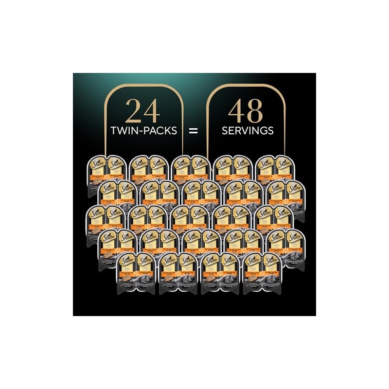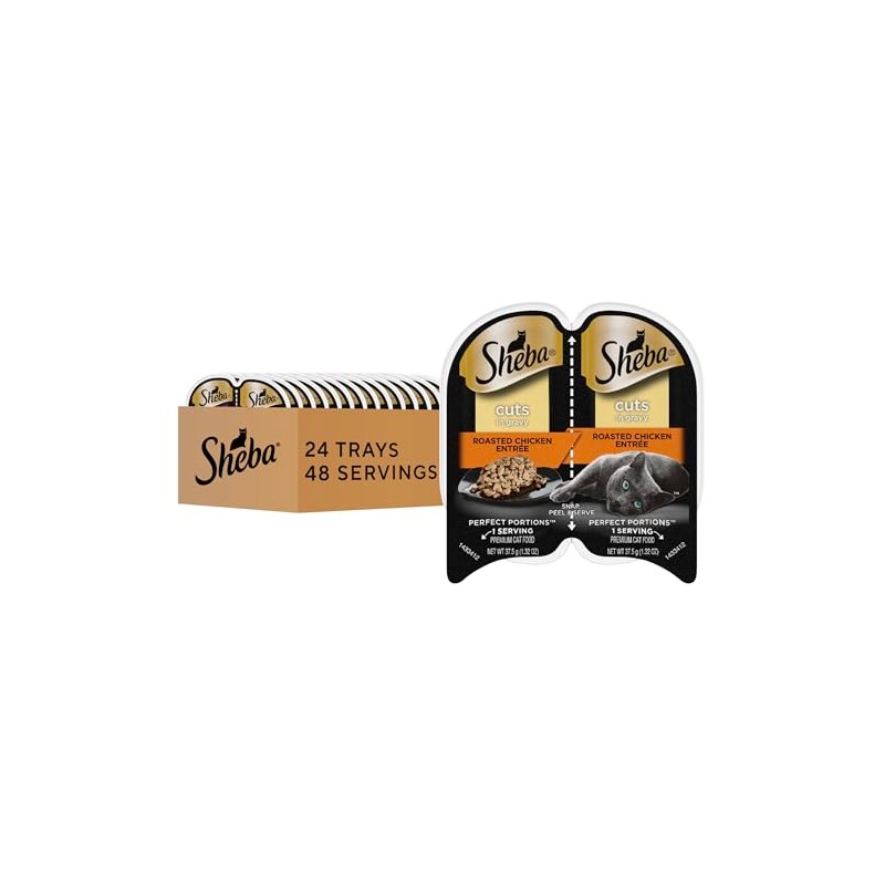 - 24-Pack: Contains twenty-four (24) 2.6 oz. twin-pack trays (48 servings total) of Sheba Perfect Portions Wet Cat Food Cuts in Gravy Roasted Chicken Entree