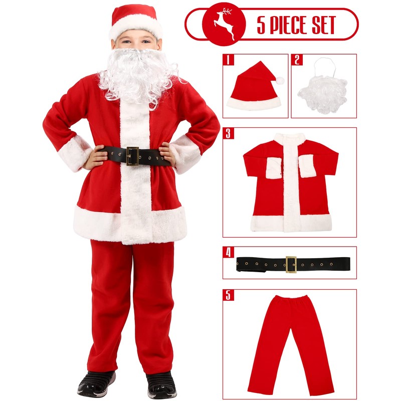 - Kids Santa Costume include: hat, beard, tops, belt, pants. For holiday, carnival, birthday, Christmas, Halloween, cosplay party, etc.