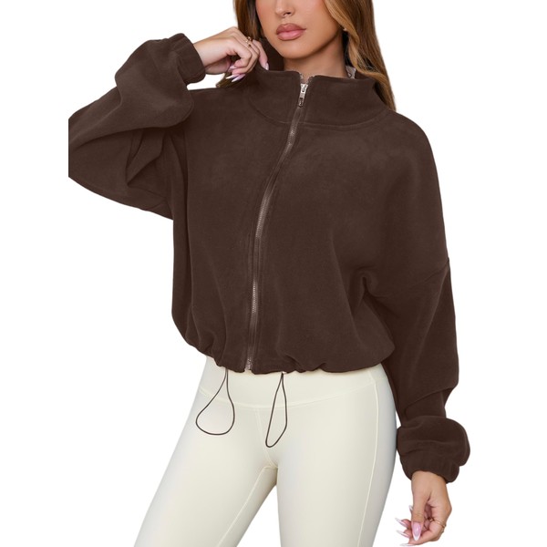 SHELOOKS Womens Casual Fleece Short Jacket Full Zip Stand Collar Sherpa Crop Coat (Coffee, Large)