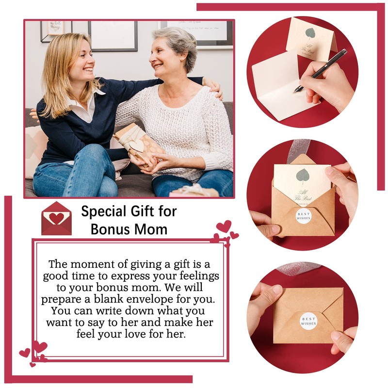 - [ Step Mom Gifts ] - You can get a package that includes 6 things as follow: a soft pouch gift bag, a wiping cloth, a message card, an empty card, an envelope, and most importantly, a necklace for your stepmom.