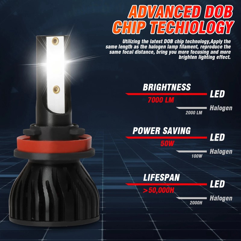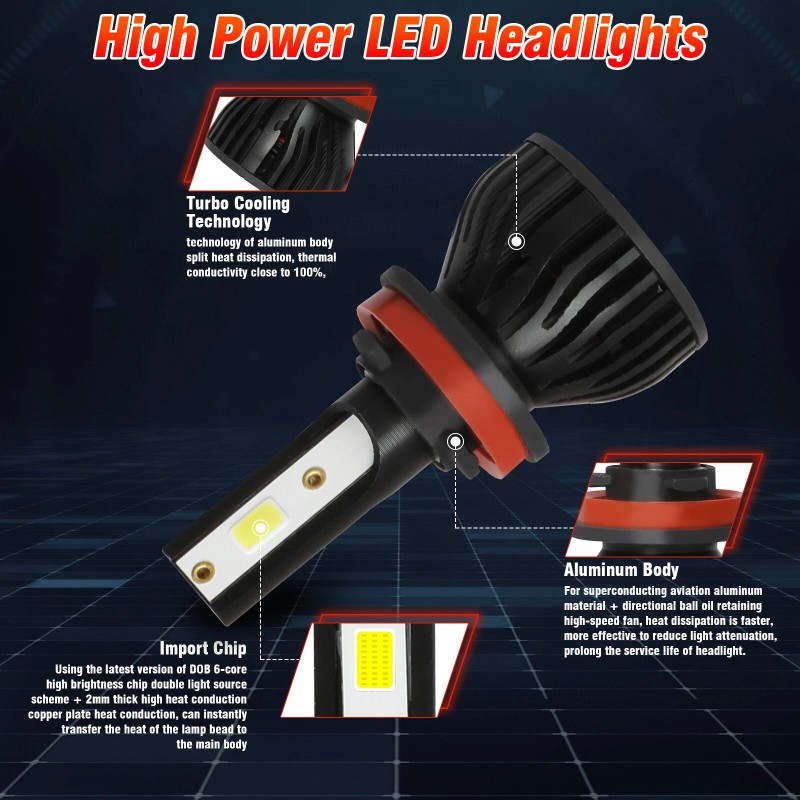 1.Latest DOB chip light source, 360 degree no blind zone. 2.Engineering beam pattern design throw more light on road evenly at appropriate angle without foggy light. 3.White light reflect road paint/signs better to show clearer road situation during night driving. 4.270 degree low beam angle with cut-off line,will not dazzle oncoming traffic. 5.All-in-one heat conduction+high speed mute fan system keep the light bulb in appropriate working temperature. 6.Built-in constant current CPU, instant full brightness without start-up relay. Packing Including: