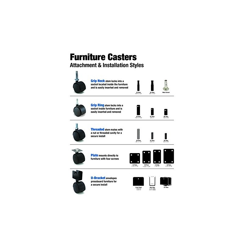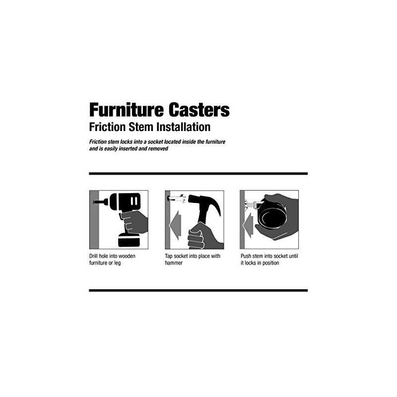 • Drill 3/8" hole 1-3/8" deep into center of leg, insert socket (included) by tapping with hammer, push caster stem into socket until it locks.