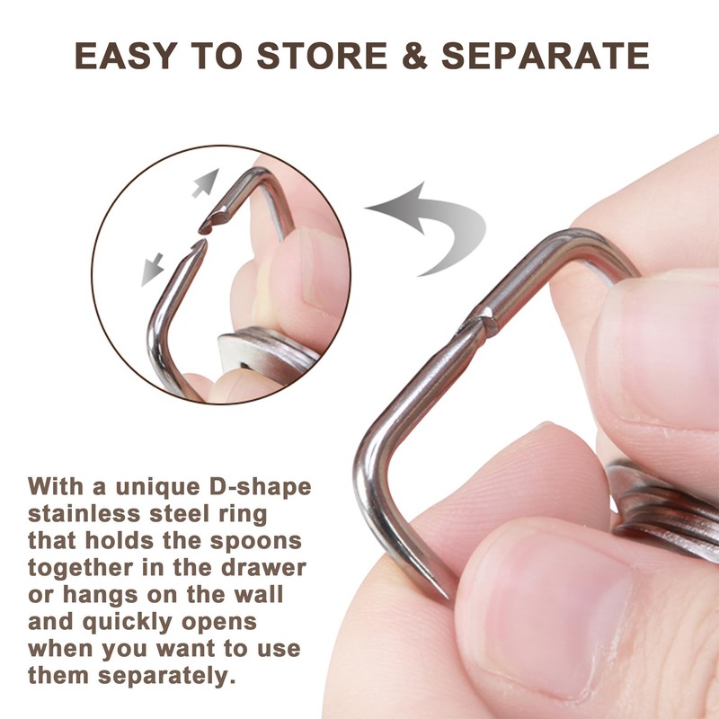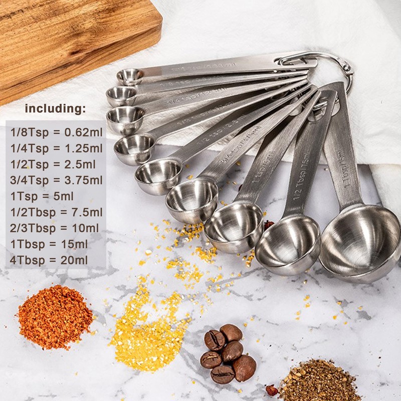 - WELL-DESIGNED 9pcs SET: Innovative round scoops fit nicely in seasoning jars and other small containers without spilling. 9pcs sets attached with unique D-ring helps keep all spoons together during cooking or baking. Measurements of each spoon are engraved on handle, never lose track of adding spices to your dishes.