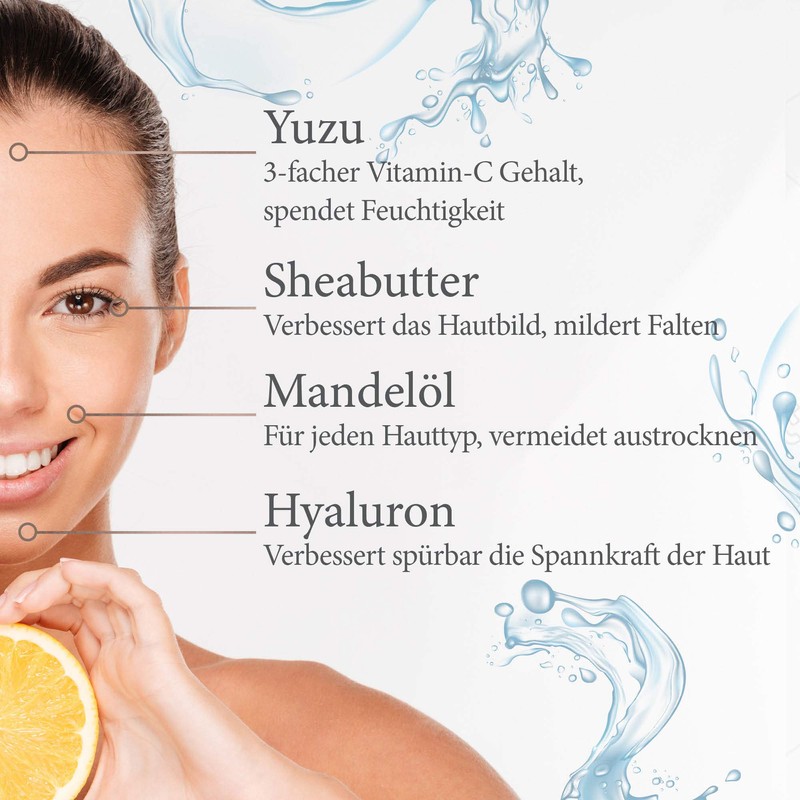 - 𝐉𝐀𝐏𝐀𝐍𝐈𝐒𝐂𝐇𝐄𝐒 𝐁𝐄𝐀𝐔𝐓𝐘𝐆𝐄𝐇𝐄𝐈𝐌𝐍𝐈𝐒 - Abgerundet wird diese Feuchtigkeitscreme für das Gesicht mit dem kostbaren Yuzu Extrakt aus Ostasien. Die seltene japanische Yuzu ist besonders Vitamin-C reich und gilt als Beauty Tipp in Japan, wo sie bereits in vielen Treatments verwendet wird. Als hochwirksames Antioxidant wirkt die Yuzu besonders vitalisierend, feuchtigkeitsspendend und der Hautalterung entgegen.