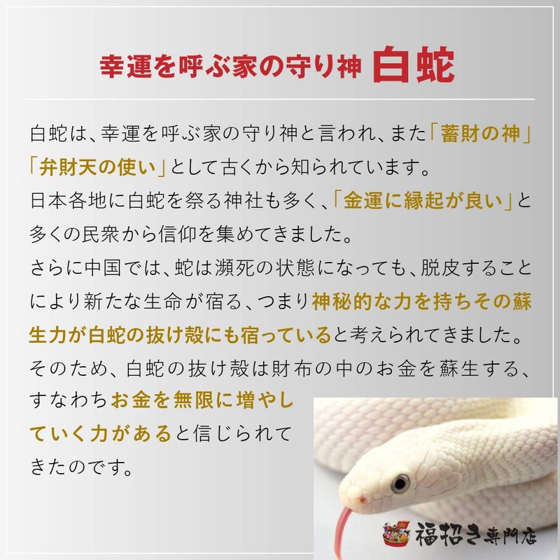 - The White Snake is said to be guardian for good luck, and has been known since the ancient times as the "God of Money" and the Amendment of Benzen". There are many shrines that festive white snakes throughout Japan and have gathered faith from many people "lucky" and "good luck." In China, it is believed that the snake will come into a new life by escaping it in a dying state, meaning that it has a mysterious power and its resurrection is also found in the shells of white snakes. It is believed to have the power to rejuvenate money in your wallet - to increase your money indefinitely