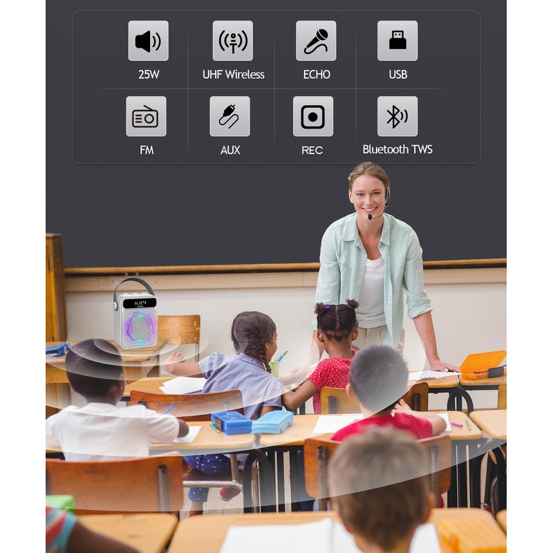 • UHF BLUETOOTH WIRELESS AMPLIFIER FOR TEACHERS: The amplifier is the perfect companion for teachers and other educators, with an acoustic output that is clear and bright enough to be heard by students. From now on, no longer worry about your low voice or noisy surroundings. Upgraded wireless connection technology, so that the microphone signal reception distance is farther, and ignore the obstruction of the signal is still stable.
