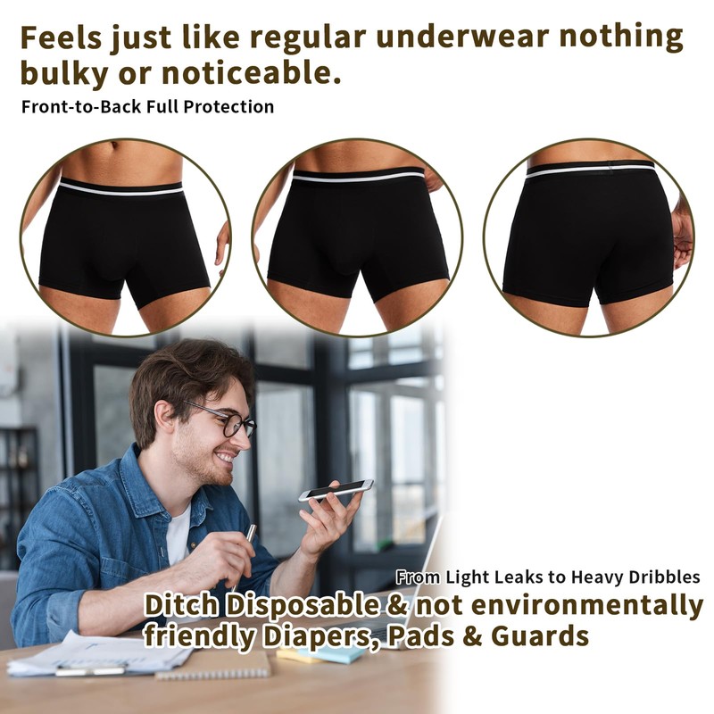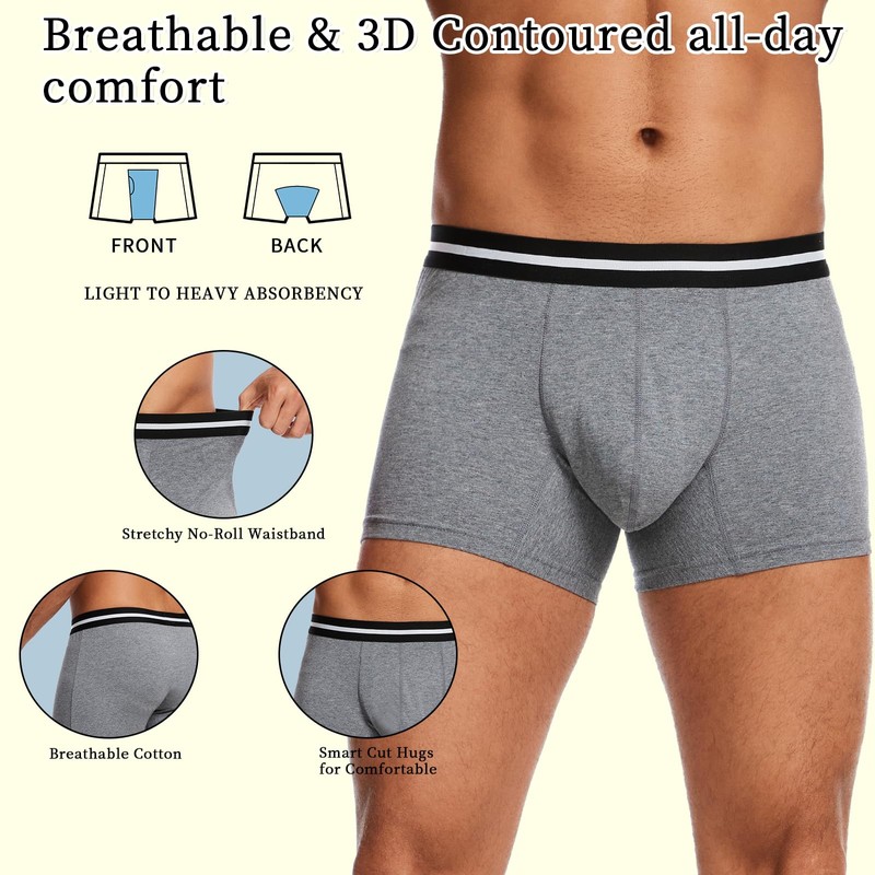 - Looks Like Regular Underwear: men's incontinence underwear combines look & feel of regular boxer briefs with breathable & durable pad & functional fly, ensuring confidence in public. Full front-to-back leak protection & loose elastic for daily ease