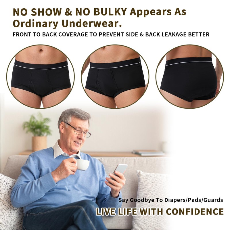 - Boost Confidence and Dignity Mens Incontinence Briefs: Designed to look like regular underwear, these underwear with incontinence pads for men are perfect for male with minor or middle leakage who are not yet ready to use disposables. The reusable incontinence underwear design with comprehensive protection and comfort helps to restore confidence and dignity in everyday life