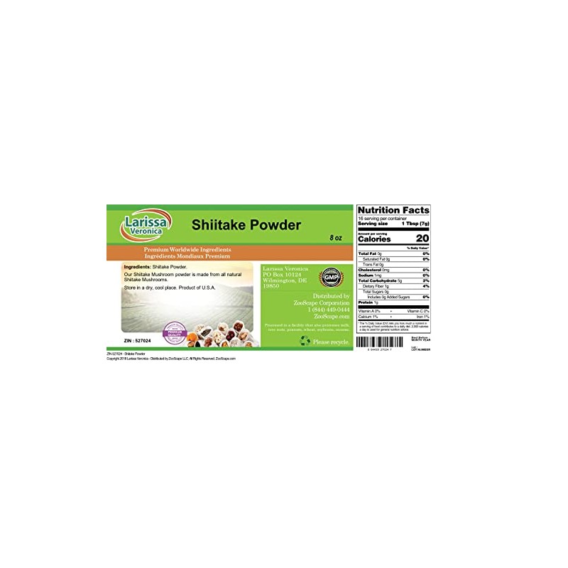 Our Shiitake Mushroom powder is made from all natural Shiitake Mushrooms. - Larissa Veronica is an exclusive line of natural premium-quality products that use only the purest and finest ingredients from around the world. Larissa Veronica is hallmarked by the highest possible standards of purity, stability and freshness. All of our products are prepared with the highest elements of quality control, from raw materials through the entire manufacturing process, up to and including the moment that the bottles or bags are sealed for freshness and shipped out to you. Our highest possible standards are certified by independent laboratories and backed by our personal guarantee. - Larissa Veronica strives to make all products affordable and we are constantly researching the market to maintain our affordability and to look for new ways to serve you and the ones you love. Larissa Veronica has become a trusted household name for many families. - Larissa Veronica is packed in tamper-proof, food-grade, recyclable containers. - ZooScape is proud to be the exclusive distributor of all Larissa Veronica spices, snacks, foods and ingredients in the United States, Canada and around the world. - Store in a dry, cool place. Product of U.S.A.