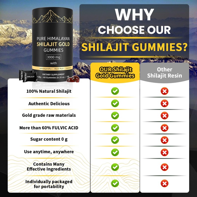 - 【SOURCED FROM HIMALAYAS】Gathered from the untouched peaks of the Himalayas, our Pure Himalayan Shilajit Gold Gummies feature premium organic, gold-grade shilajit, sourced from 18,000 feet above sea level. With big data, this high purity gummy, has become a balanced, healthy, trusted and powerful energy packed supplement for our daily lives