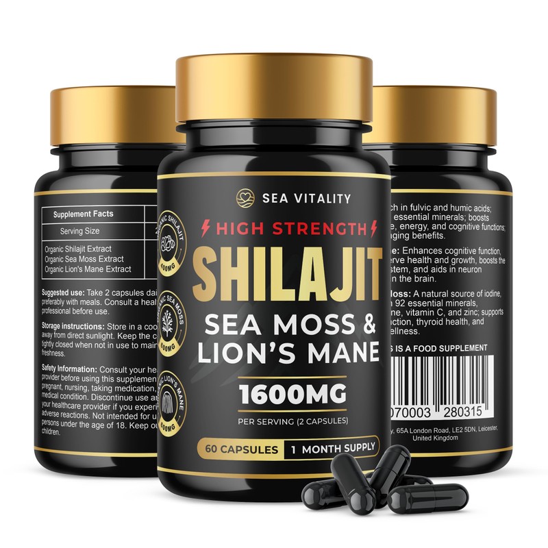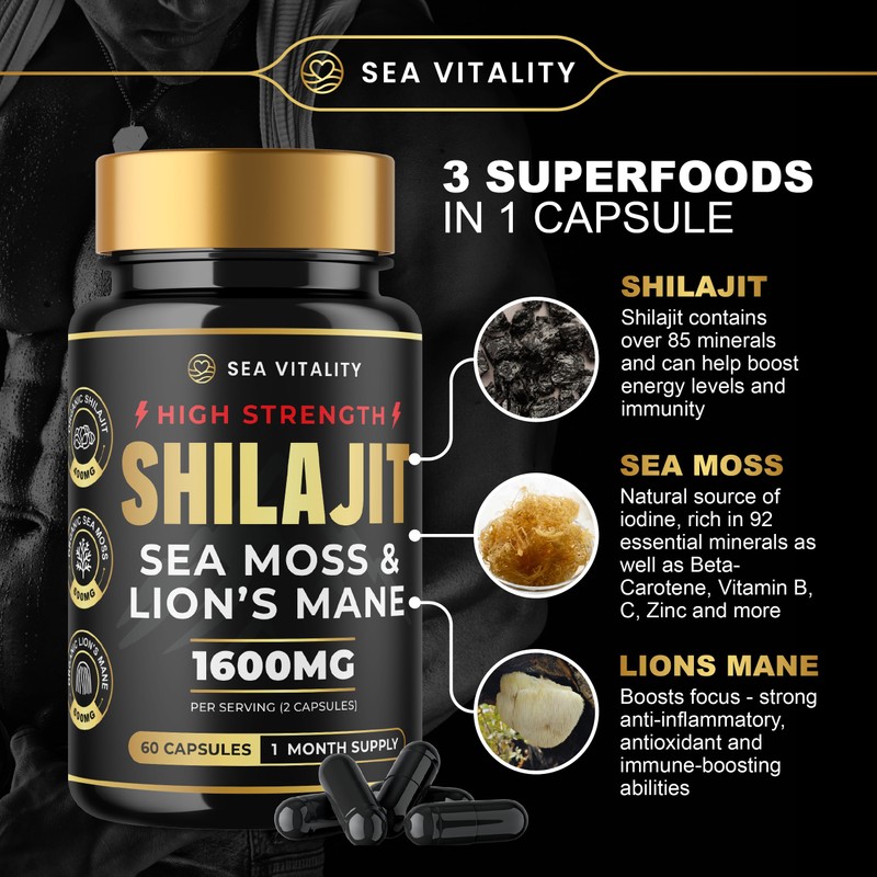 Shilajit SeaMoss and Lions Mane Capsules - 60 High-Strength Vegetable Capsules, 1600mg per Serving, Pure Shilajit, Natural Sea Moss, and Lion's Mane for Enhanced Cognitive and Physical Health