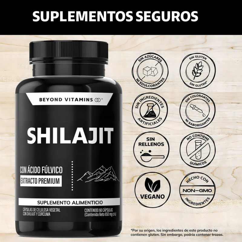 - +60 Cápsulas Shilajit Beyond Vitamins contiene una combinación completa de Extracto Premium de Resina Shilajit, Ácido Fúlvico y Raíz de Cúrcuma. Nuestro Shilajit encapsulado de 500mg no solo promete conveniencia, sino también una experiencia insuperable. Imagina recibir un producto que ha sido desarrollado con la más alta tecnología de extracción, purificación, secado y molido, todo para ofrecerte el Shilajit puro del Himalaya en su forma más pura y potente. Cada cápsula está cuidadosamente diseñada para asegurar que obtengas la máxima pureza, sin malos sabores y con una dosificación precisa, permitiéndote disfrutar de los beneficios del Shilajit sin complicaciones. Nuestro Shilajit está certificado en cada lote con un alto contenido de Ácido Fúlvico, validado por nuestros rigurosos Certificados de Análisis (CoA).