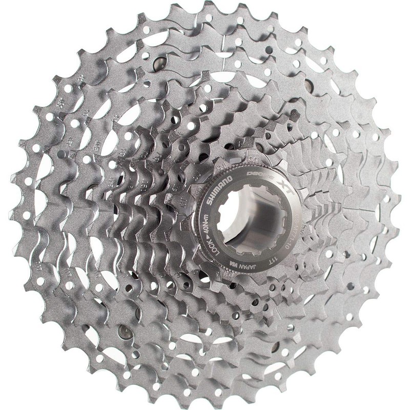 The XT-10 speed cassette uses coated steel gears for superior durability, but that doesn't mean it weighs a ton. The largest six gears are minimal in design and are attached to two lightweight alloy spiders - three gears for each spider. The four smallest gears are attached separately and the entire batch is secured with an elegant alloy locking ring. This cassette is compatible with Shimano's Dyna-Sys 10 speed gears and rear derailleur.