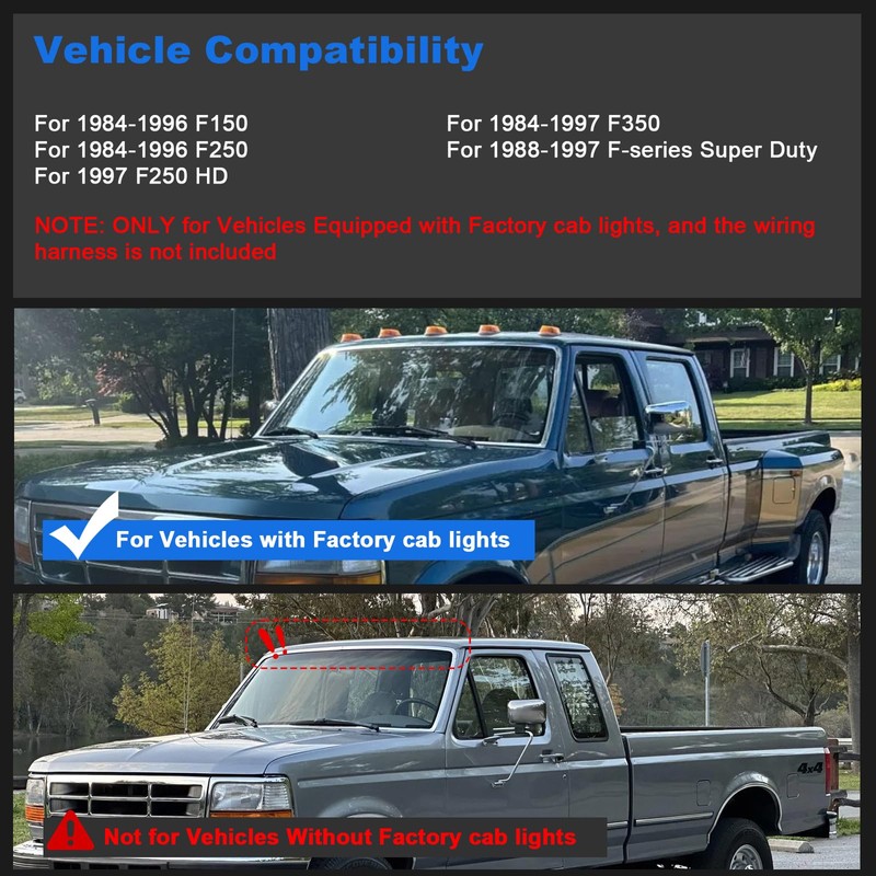 - Vehicle Compatibility - Legal on road, DOT/SAE approved. Roof marker lamp assembly compatible with 1984-1996 F150/ 1984-1997 F250 F350 with stock cab marker lights.